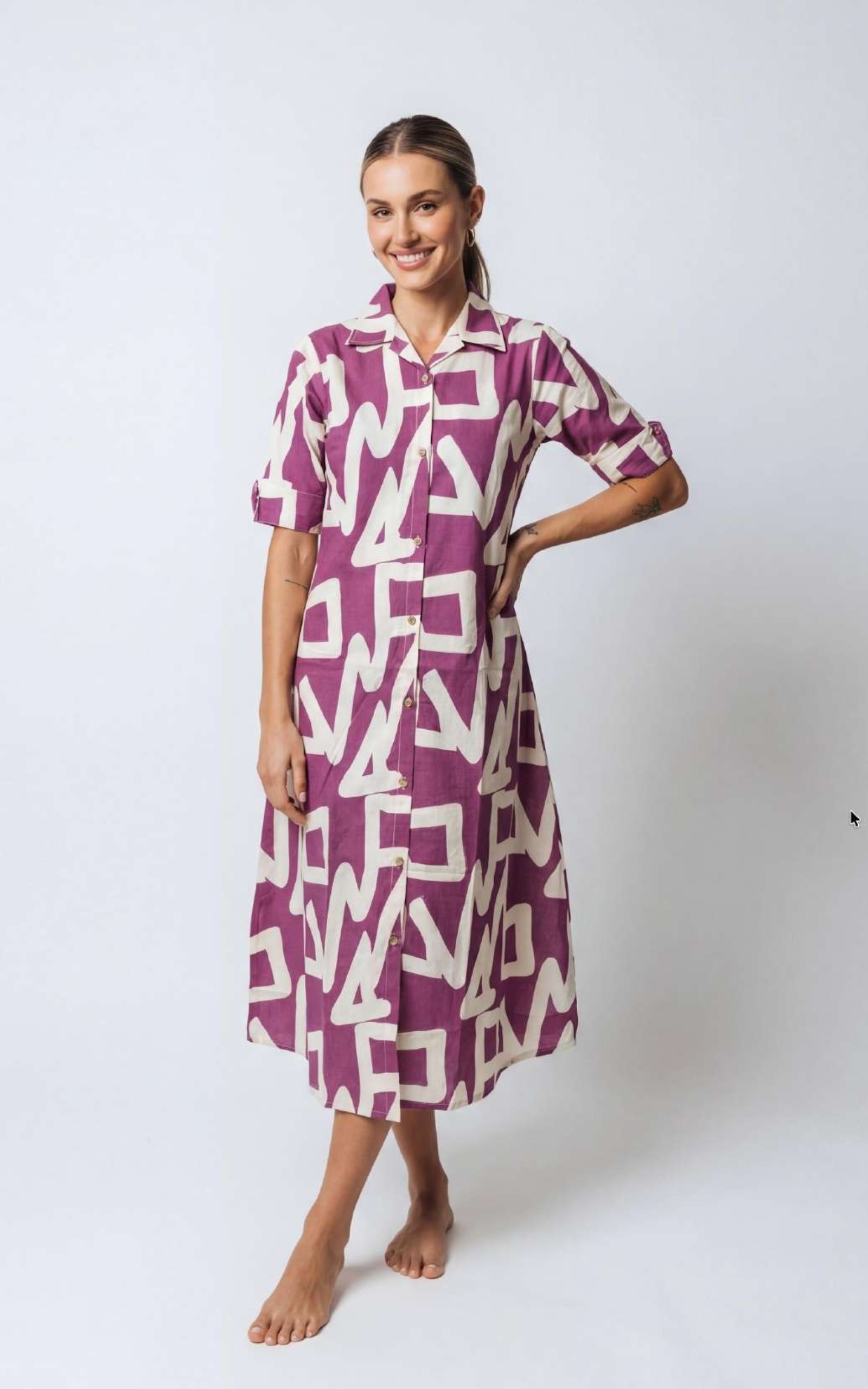 A ready midi dress made with friendly flex fabric. This dress bursts with cream zigzag motifs on a fruit purple ground base. It features a classic collar with 3/4 short sleeves and a front button design. The A-line cut skims gracefully below the knee, providing all-day comfort.