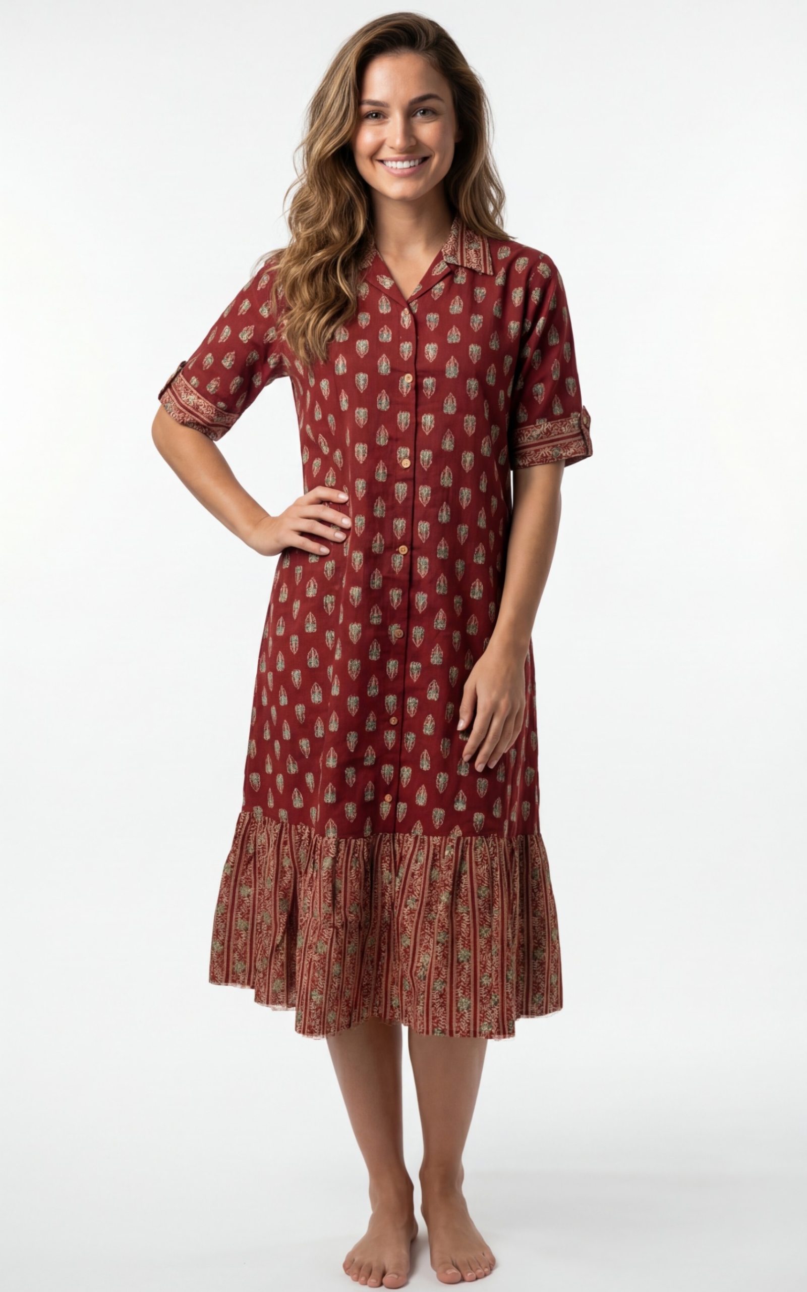 Soft and breathable midi dress crafted from premium cambric cotton. The reddish maroon dress showcases an intricate gold paisley print with half sleeves, button-front styling, and a flared ruffle hem that adds a touch of elegance. Comfortable for all-day wear, it is perfect for casual outings, work-from-home days, or weekend brunches.